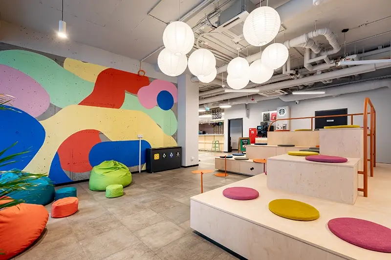 Agora jest jedną z najważniejszych przestrzeni prywatnego akademika. Trybuna zlokalizowana w centrum tego miejsca pełni rolę mebla służącego do odpoczynku, spotkań, interakcji między mieszkańcami oraz poczekalni.