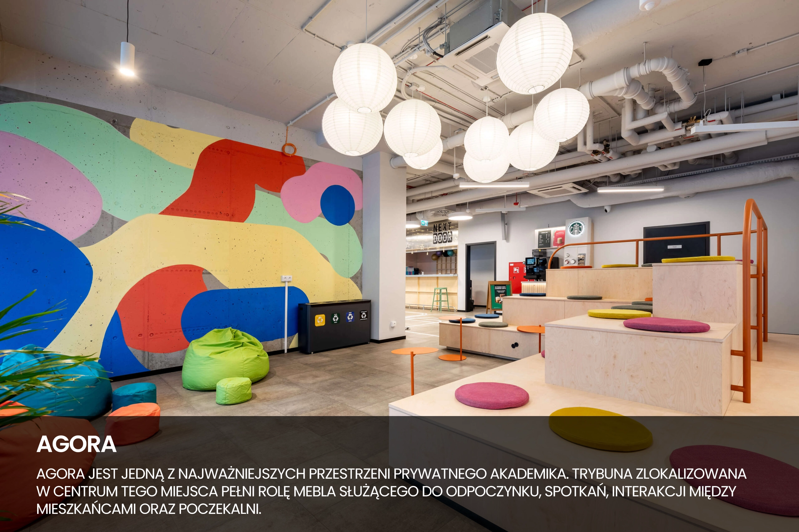 Агора – один із найважливіших просторів приватного гуртожитку. Трибуна, розташована в центрі цього місця, служить предметом меблів для відпочинку, зустрічей, взаємодії між мешканцями та кімнатою очікування.