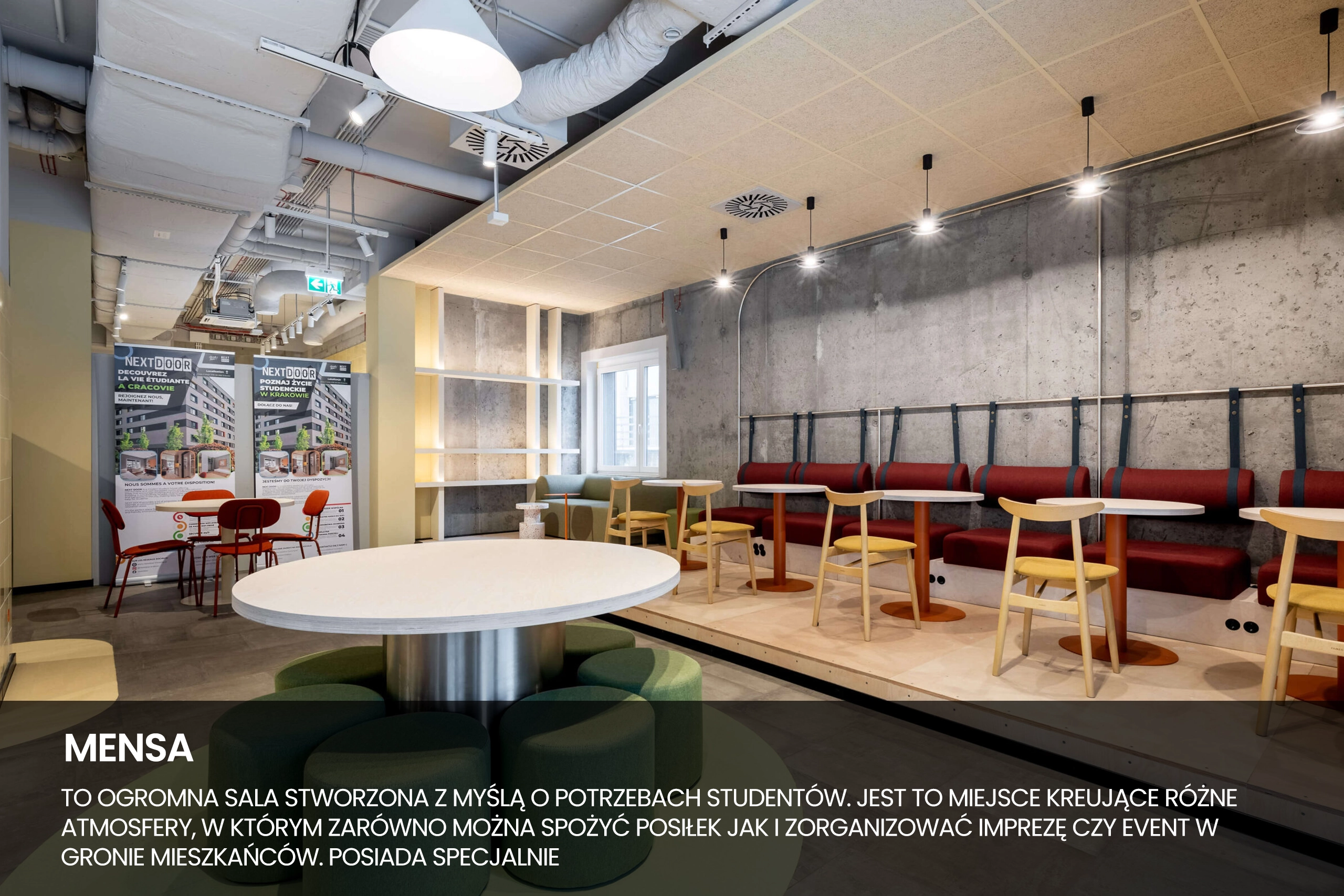 У гуртожитку Next door ви можете користуватися широким спектром місць загального користування. Ми підготували спеціально адаптовану навчальну зону, якщо ви хочете зосередитися на навчанні в тиші та спокої, а також ігрову зону, де ви можете відпочити у вільний час. Серцем нашого гуртожитку є менса, де ви можете зустрітися з друзями, і саме тут ми організовуємо заходи для наших мешканців.